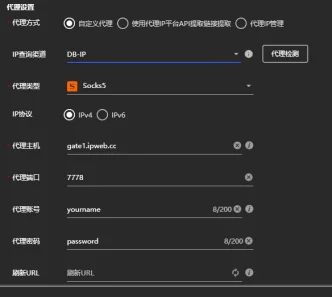 住宅代理:服务器地址填写 gate1.ipweb.cc,端口填写7778。