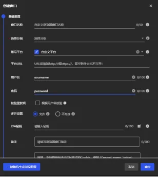 登录信息:如需自动填充账号密码,可在此预先填写,比特浏览器会自动管理 Cookie 和登录状态。