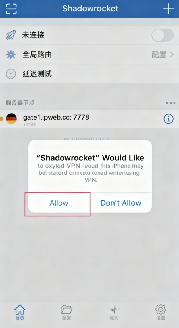 授予 VPN 配置权限(首次使用)如果您是首次在设备上使用 Shadowrocket,系统会弹出提示,请求允许添加 VPN 配置。请点击 “允许”,并根据提示输入您的设备锁屏密码进行验证。